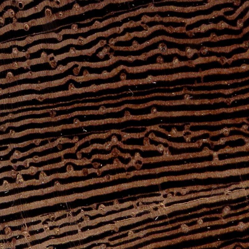 Wenge (Millettia laurentii) is a bold African hardwood prized for its dramatic dark color and striking grain. The wood ranges from very dark brown to nearly black, often highlighted by lighter brown or tan streaks that create strong visual contrast.